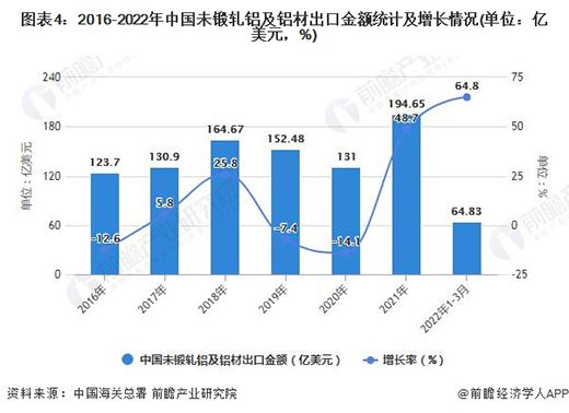 2022年一季度中國未鍛軋鋁及鋁材出口量超過160萬噸
