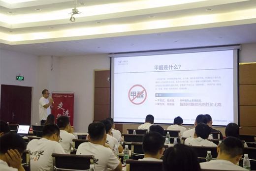為了讓美佰利團隊能更深入了解華洲板材的環保魅力,華洲派出工程師劉威先生主講“營銷專場培訓”環節,圍繞“科學認識甲醛的危害”、“華洲安醛板優勢及銷售話術”、“華洲安醛板性能終端試驗操作”等話題做深入淺出的分析講解。
