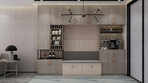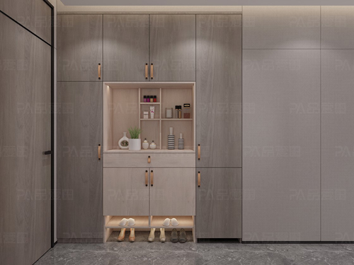 入門即是玄關(guān),秋日晴風(fēng)系列塑造了一個(gè)從工作到家空間轉(zhuǎn)換的感覺。玄關(guān)柜滿足儲(chǔ)藏鞋子、衣物的功能,收納柜上的擺件無形展現(xiàn)了精致感,簡(jiǎn)潔而不失輕奢感。