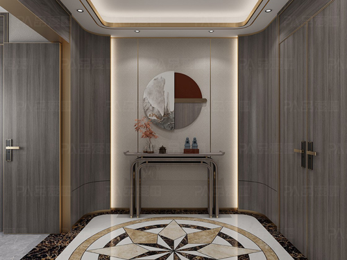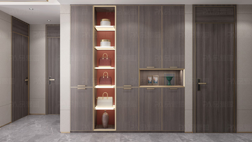 “午夢(mèng)輕回”系列以沉穩(wěn)的高級(jí)灰、陽光活潑的香檳色,在入戶兩側(cè)引入深木色的收納柜體,讓整體視覺更富有層次感,質(zhì)感也更為飽滿。