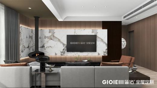 輕奢風客廳,木飾面與石材的體塊分割,使客廳背景墻呈現出強烈的序列感和縱深感,將舒適的空間氛圍娓娓道來。