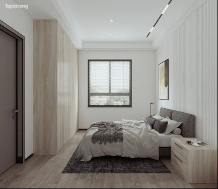 床頭墻掛一幅幾何抽象畫,側邊木質床頭柜,衣柜以原木色柜體,天花裝內置小燈,整個空間顯得簡約優雅而自然。冰川雪瑜花色增加了臥室中的溫軟氣質,細節中展現著生活的小確幸。