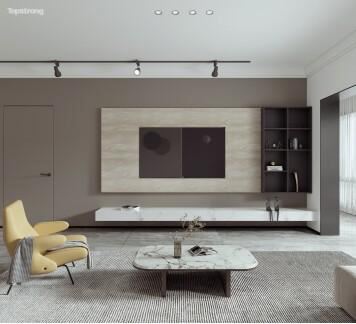 整體空間以原木色墻柜+大白墻的空間,營造出一種簡約原木風的氣息,通過高級灰花色背景墻,以開放式的格局設計,實現了一個輕松舒適而簡約大氣的居住氛圍。