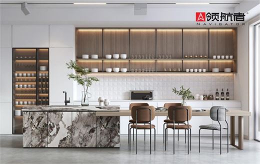 所以領(lǐng)航者采用了“隱藏式設(shè)計(jì)”,把雜亂、不常用到的東西全部收藏起來(lái),減少臺(tái)面上用品的擺放,消除視覺(jué)上的雜亂感。廚柜加倒臺(tái)的設(shè)計(jì),也便于家人之間的互動(dòng),更是設(shè)計(jì)美學(xué)的藝術(shù)。