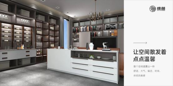 一面生活,一面藝術。吧臺連接酒柜設計,以悠然簡約的情調為畫筆,簡單勾勒出一處舒適優雅的生活空間。
