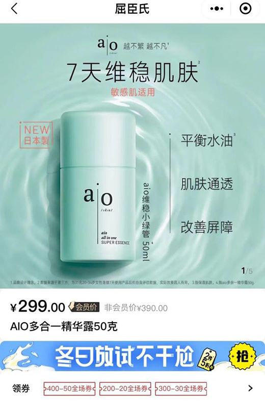 《化妝品財經在線》記者搜索屈臣氏微信小程序和天貓官方旗艦店時發現,目前在線上,屈臣氏已首發aio多合一精華露這一單品,官方售價為390元/50g,恰逢雙十二折扣期,屈臣氏小程序會員價僅售299元。