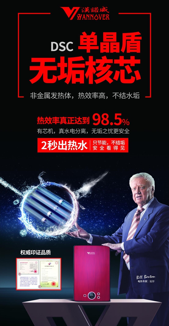 二十年來,漢諾威電器堅信“科技鑄就未來”,因而特別注重以創新技術實現產品性能革新,解決行業痛點,為用戶創造更健康的沐浴生活。漢諾威電器集中精力突破行業技術難題,用顛覆傳統的“DSC單晶盾”非金屬三超水電分離發熱技術改變行業現狀,滿足消費者的健康沐浴需求。