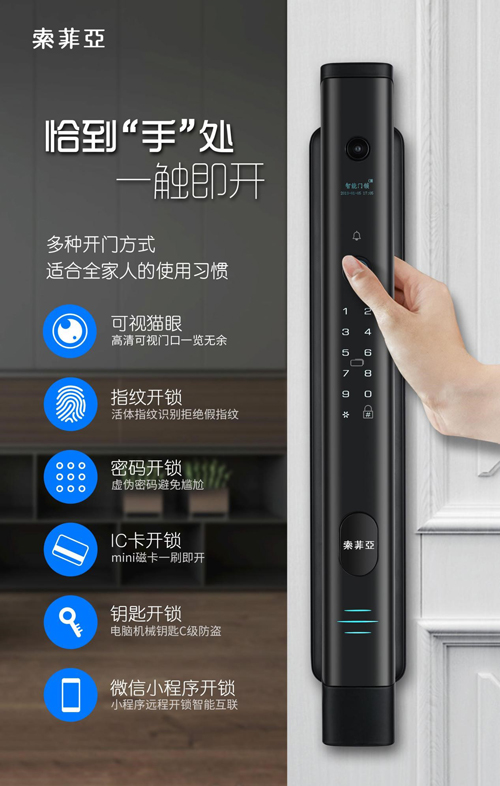 索菲亞指紋鎖,是全民智能家居生活的重要擁護者,也是智能門鎖產品的重要耕耘者。其憑借多年來在智能領域所積累的實用經驗與所掌握的先進技術,不斷為當代消費者帶來性價比高且時尚智能的指紋鎖產品,同時也為老百姓締造時尚便捷的新生活做出了非凡的貢獻。而在塑造產品、升級產品的過程中,索菲亞團隊善于總結其他智能產品的發展經驗及尖端技術,也善于結合門鎖的使用實際與潮流趨勢,力爭將智能科技運用得淋漓盡致,修煉出專屬于索菲亞的強大內功。