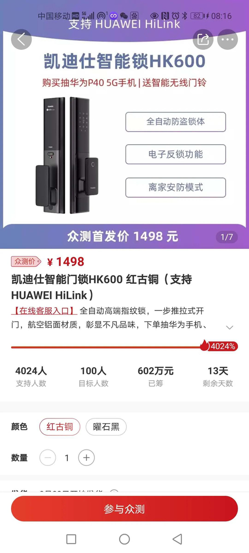 近日,凱迪仕加入HUAWEI HiLink生態產品圈的第二款智能鎖HK600已于8月14日登陸華為商城開啟眾測。HK600最吸引人之處莫過于其只有1498元的超高性比價首發價,眾測結束之后將恢復原價1698元。