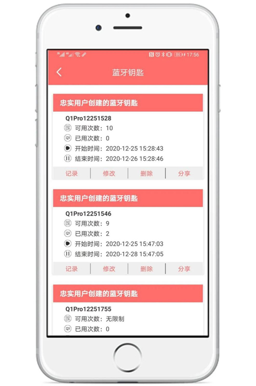 以保仕盾Q1Pro為例,經(jīng)銷商可以向客戶闡述電子藍(lán)牙鑰匙功能,該功能可以遠(yuǎn)程發(fā)送臨時(shí)密碼給朋友,朋友通過小程序就能快速開鎖,分享人可以隨時(shí)查看、修改鑰匙信息,及移除鑰匙,非常方便。