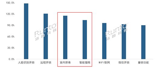 事實上,今年主流品牌推出的新品中,配備可視貓眼和室內(nèi)屏幕基本上已成為共識。根據(jù)洛圖科技(RUNTO)線上數(shù)據(jù)顯示,在2022年上半年發(fā)布的新品中,TOP20的新品中有65%配備了貓眼、40%配備了室內(nèi)大屏。這兩個功能可以實現(xiàn)24小時實時監(jiān)測,安全系數(shù)相對更高,因而比較受消費者青睞,2022年7月,智能貓眼和室內(nèi)大屏顯示銷量同比增長均超90%。2022年7月中國智能門鎖線上市場功能同比增速