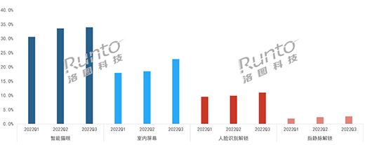 內在原因為企業以創新為導向,擴展產品功能,滿足消費者個性、多樣化需求。洛圖科技(RUNTO)線上數據顯示,2022年,智能貓眼功能從年初的30.6%增長至第三季度的34.0%;在2022年第三季度,配備室內屏幕的智能門鎖占據了22.8%。