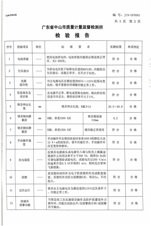 其中,普鑫智能鎖在“電池容量”、“欠壓指示”、“電源適應性”、“信息保存及誤識率”、“鎖舌伸出長度”、“鎖舌軸向靜載荷”、“鎖舌側向靜載荷”、“手動操作強度”、“抗電強度”、“阻燃”、“過壓運行”、“防破壞報警功能”等12個單項檢測中,均符合國家要求!