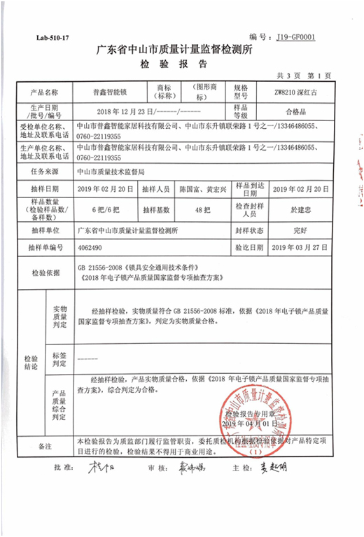 2019年2月20日—4月1日,在中山市質量技術監督局專業級質檢實驗室中,經過近兩個月的縝密檢測與嚴苛考驗,普鑫智能鎖最終拿到了“樣品符合全部檢測要求”的優異成績。這是對普鑫多年深耕行業,打造匠心產品的肯定,也是對普鑫專注智能鎖研發創新的一種鼓勵。同樣地,在普鑫謹慎到幾乎苛刻的選材與產品質檢機制下,這樣的結果并不出人意料。