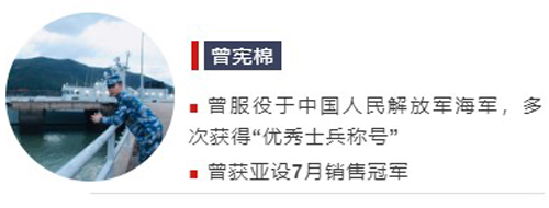 亞設體育的7月銷售冠軍,是“年少有為不自卑”的曾憲棉。他本人曾于中國人民解放軍海軍部隊擔任“潛水艇戰士”,并在服役期間多次獲得“優秀士兵”、“優秀義務兵”、“優秀戰士”等光榮稱號。