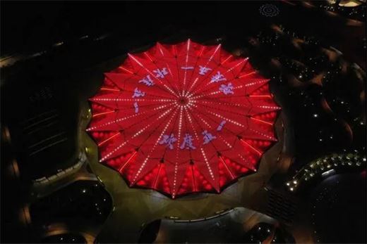 夜晚點亮的“石榴花”體育場別具一格。夜景泛光設計突出表現(xiàn)石榴花綻放的姿態(tài)和絲綢舞動的韻律。靈動的曲面穿孔幕墻與屋面透光陽光板,安裝定制化LED點光源燈具,組成了一個起伏流動的巨型顯示屏,可以播放定制視頻,配合各大節(jié)點呈現(xiàn)出異彩紛呈的視覺效果。航拍下屋面可切換星光與成像兩種模式,帶來震撼超凡的視覺體驗。局部立面補充投光燈表現(xiàn)建筑結(jié)構(gòu)的起伏轉(zhuǎn)折。
