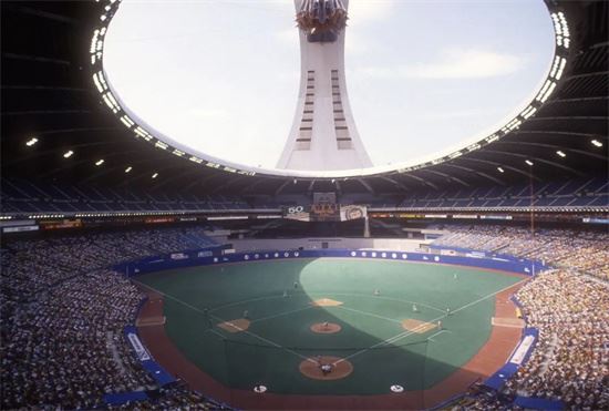 20世紀80年代中期,美國職業棒球大聯盟的蒙特利爾博覽會隊在奧林匹克體育場享受清新的空氣,體育場的織物屋頂收縮到毗鄰的塔頂。蒙特利爾博覽會隊于2004年離開蒙特利爾,更名為華盛頓國民隊。攝影:Focus On Sport/Getty Images North America
