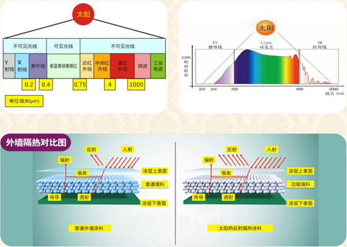 南天反射隔熱涂料借助一些對太陽光當中的紅外波段有特殊響應的功能顏填料,能夠對太陽輻射中可見光波段(0.4-0.72μm)和近紅外波段(0.72-2.5μm)部分的能量進行反射的節能型功能涂層材料。