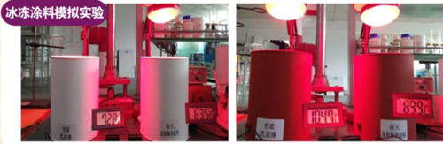 實驗開始后,同時打開燈源,觀察桶頂背面溫度變化,使用南天冰凍涂料的桶頂背面溫度大大低于使用普通桶頂背面的溫度,經過3分鐘后,溫度差達到15℃。由此可見,使用熱反射隔熱涂料確實可以很大程度上起到隔熱效果。