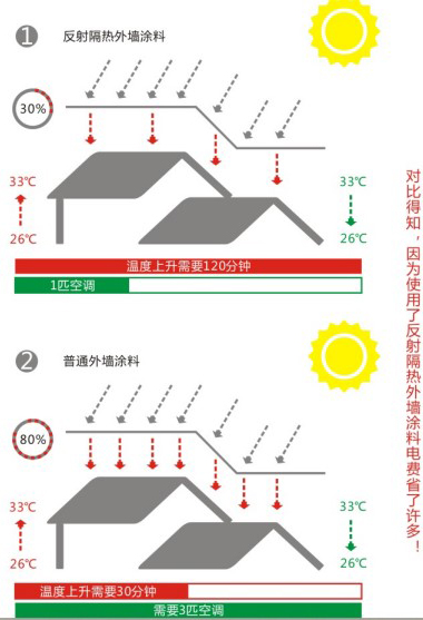 即:減少太陽光在建筑物外墻產生的熱量,有效降低外部熱量向建筑物內部的傳導,使得室內持久保持較低溫度,節省空調等電能耗費。