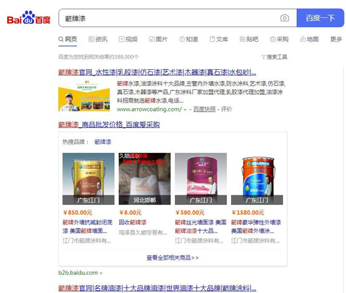瀏覽網(wǎng)頁,排在首位的是箭牌漆官網(wǎng),這也是消費(fèi)者進(jìn)一步了解品牌的重要渠道。稍加閱讀,我們便可輕松將箭牌漆的品牌簡介、品牌形象、產(chǎn)品類別、產(chǎn)品詳情、技術(shù)服務(wù)、招商政策、加盟優(yōu)勢(shì)等資訊“一網(wǎng)打盡”。倘若消費(fèi)者需要購買藝術(shù)涂料,那只需要點(diǎn)擊箭牌漆官網(wǎng)中藝術(shù)涂料的子頁面,便可掌握到拉斐爾、金絲玉帛、水晶之戀、真維斯等多種類別藝術(shù)涂料產(chǎn)品的功能、優(yōu)勢(shì)及展示效果,更可通過比價(jià)找到最為稱心如意的產(chǎn)品。