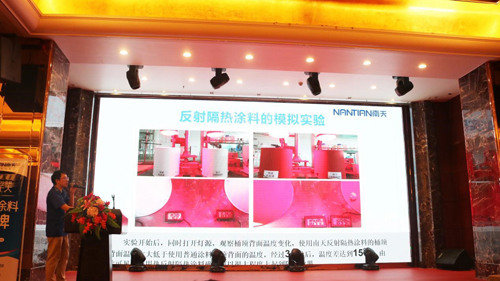 在活動的過程中,南天涂料研發團隊經過多年反復研發、測試,通過國家檢測標準,也獲得國家檢測中心檢測報告。今年推出新產品反射隔熱涂料主要是借助一些對太陽光當中的紅外波段有特殊響應的功能顏填料,能夠對太陽輻射中可見光波段(0.4-0.72μm)和近紅外波段(0.72-2.5μm)部分的能量進行反射反射的節能型功能涂層材料。