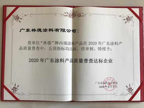 經過層層篩選,在此次普查中,林德漆榮獲“2020年廣東涂料產品質量普查達標企業”殊榮,得到了權威機構對林德漆產品品質和服務的認可。