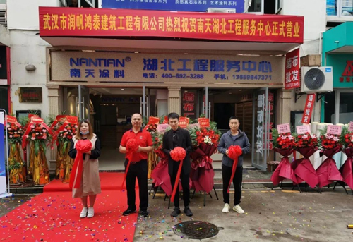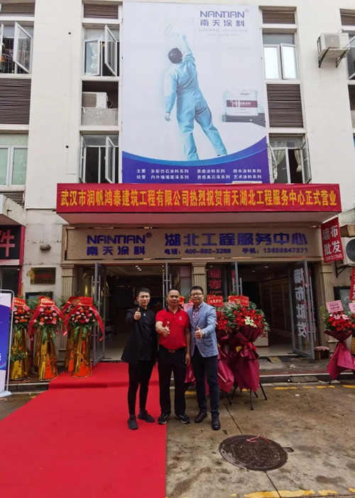 此次是南天涂料繼安徽創建生產基地后迎來的雙重喜訊,活動當天南天涂料董事長張銓秋、銷售總監祝健輝,武漢市潤帆鴻泰建筑工程有限公司董事長蔡帆等領導親臨開業典禮并參與了剪彩儀式。
