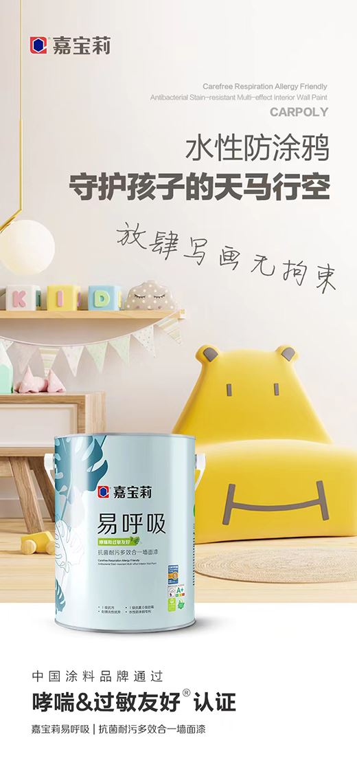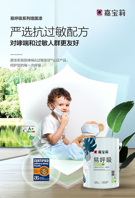 假期或許很多家庭會選擇出游郊外“森林氧吧”,但易過敏體質的孩子常與自然“絕緣”,居家時間較多。家長往往會忽略,其實居家環境也會有致敏源。研究表明,居家環境孩子的呼吸健康與“墻”免疫力相關。由于墻面極易滋生細菌,并通過呼吸道傳播,所以墻面漆的原材料和抗菌性很重要。嘉寶莉的易呼吸墻面漆嚴選配方、原材料,是中國涂料品牌首款通過國際認證機構ASL的哮喘&過敏友好?認證,適合易敏人群的超高環保產品。
