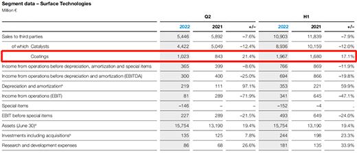 與去年同期相比,表面技術部門的銷售額為54億歐元,同比下降7.6%。涂料部門的可觀銷售增長無法抵消催化劑部門的強勁下滑。同比銷售額下降主要是由于催化劑部門的銷量大幅下降。這主要是由于半導體供應不足和中國的封鎖導致汽車行業需求疲軟的結果。不計特殊項目的息稅前利潤為2.27億歐元,較2021年第二季度報告的2.89億歐元大幅下降。這是由于涂料部門不計特殊項目的息稅前利潤大幅下降,主要是由于固定成本增加。