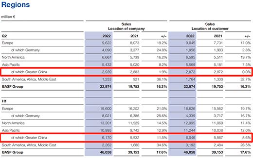 巴斯夫集團2022年第二季度和上半年區域銷售
