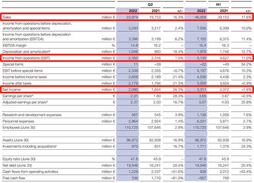 與去年同期相比,材料部門的銷售額大幅增長29.9%,達到49億歐元。這主要是單體部門銷售強勁增長的結果。高性能材料部門也錄得相當大的增長。積極的銷售業績主要是由于原材料價格上漲導致價格大幅上漲。不計特殊項目的息稅前利潤為6.68億歐元,與2021年第二季度相比大幅下降。在這兩個部門,較高的利潤率無法抵消固定成本的增長。