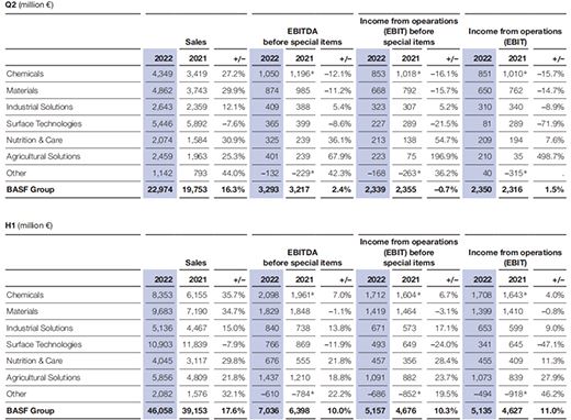與2021年第二季度相比,化學品部門的銷售額大幅增長27.2%,達到43億歐元。兩個運營部門都對增長做出了貢獻。銷售增長主要是由兩個部門的價格顯著上漲推動的,主要是由于需求持續強勁,原材料和能源價格上漲。不計特殊項目的息稅前利潤8.53億歐元保持在較高水平,但遠低于去年同期異常強勁的收益。這主要是由于石化部門的收益大幅下降,主要是由于能源價格上漲和貨幣影響導致固定成本增加。