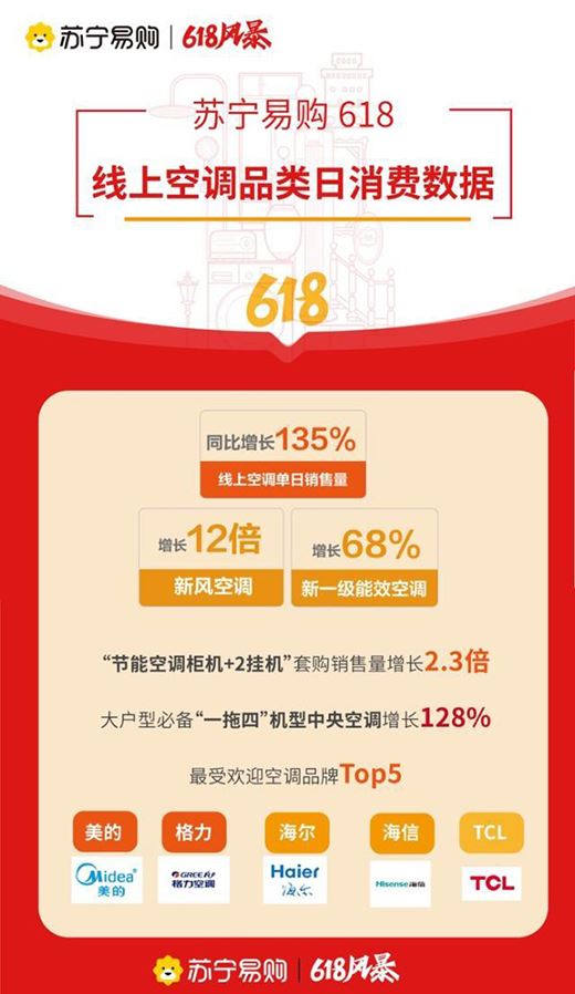 家用空調需求持續上漲,蘇寧易購加碼空調補貼,迎來銷售爆發。端午節后首日,蘇寧易購線上空調品類日單天銷售量同比增長135%,其中新風空調增長超12倍。空調套購率大幅提升,“節能空調柜機+2掛機”套購銷售量增長2.3倍,大戶型必備“一拖四”機型中央空調增長128%。以舊換新帶動綠色節能商品走俏,蘇寧易購線上新一級能效空調銷售量同比增長68%。