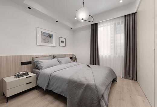 主臥選用原木地板做地面,屋頂做雙眼皮吊頂設計,擴大視覺空間,床頭背景墻以白色為主要設計,靠近地面增加床高的木板條,整體迎合空間設計,讓空間更加溫馨舒適,床對面是頂到屋頂的衣柜,收納空間很足。