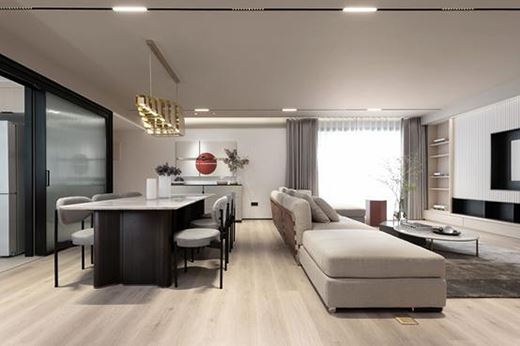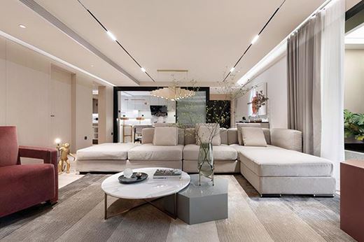 客廳選用白色瓷磚做地面設計,屋頂做大平面吊頂設計搭配無主燈,在吊頂內側還增加了黑色線條與燈帶,讓房屋增加溫馨感,同時還讓空間更顯空間感,家具選用淺色和紅色做搭配,整體舒適又亮眼,沙發前搭配不規則小茶幾,設計感十足。