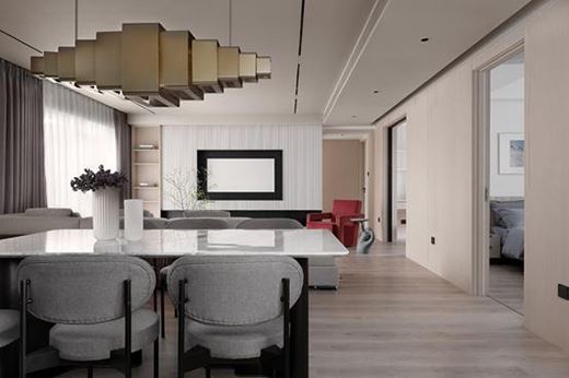客廳沙發的后側就是餐廳設計,客餐廳在一個大空間內,選用白色大理石臺面黑色柱子做餐桌,同時搭配與家具同一色系的細腿餐椅,時尚又美觀,餐桌上方懸掛寶塔式掛燈,金屬元素凸顯空間精致。
