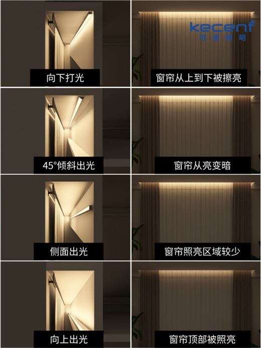 如果大家喜歡窗簾從上到下被擦亮的效果,則可以選擇常規明裝款的LED線條燈向下打光,光束向下投入地面的懷抱,完整呈現窗簾的輪廓;如果更想擁有窗簾從亮變暗的效果,可安裝陰角款的LED線條燈,45°傾斜出光,窗簾上半部分亮,下半部分暗,亮暗和諧過度;此外,安裝時讓LED線條燈側面出光或向上出光,也會呈現出不一樣的效果。