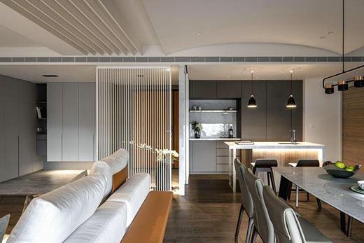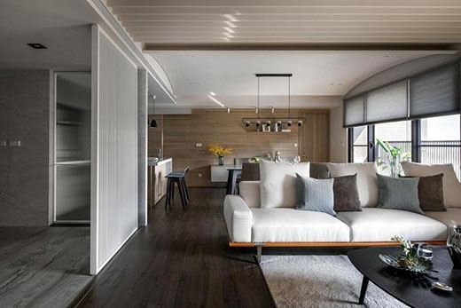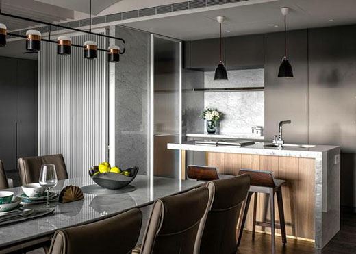 客廳連接的是餐廚一體式的開放空間,讓整個家居的使用變得利落了起來。暗黑色的木質地板與低調簡單的魚肚大理石墻面形成鮮明對比,落地式的三扇窗戶讓空間透亮起來。