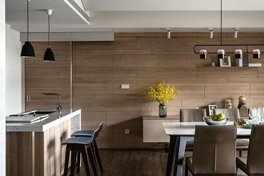 與廚房銜接的高雅小餐廳,墻面也是拼接的木紋色,餐廳的墻面上設置了柜子,可以放一些酒和雜物,安裝的筒式射燈以及裝飾品的搭配也讓用餐環(huán)境變得優(yōu)雅起來。