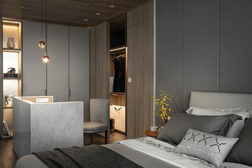 臥室是比較私密以及放松休閑的環(huán)境,所以也是使用了無主燈的設計搭配。衣帽間的筒燈序列,工作區(qū)的聚焦吊燈,睡眠區(qū)的床頭燈,讓臥室通透了起來。
