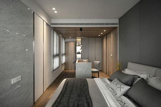 再來看看臥室的環(huán)境,這個角度看過去拉伸感很強烈,衣帽間與臥室用了簡單的隔斷,衣柜部分做的是封閉式柜子,私密性更佳,如果男同胞們不善于收拾衣柜,那這小門一關,誰也看不見。中間做了類似小吧臺的平面桌,可以為主人增加放置物品的空間,也可以學習以及工作的環(huán)境,衣柜顏色與地板的深色搭配起來非常的舒適,搭配和諧、不突兀。