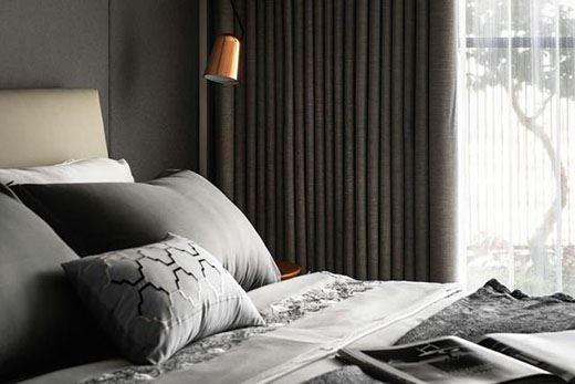 床頭用的是灰色與深褐色的背景墻搭配,再加上深灰色的床上用品,整個房屋沒有多余的裝飾,采用純色大面積渲染,整個房間顯得非常高級、簡潔、大方。