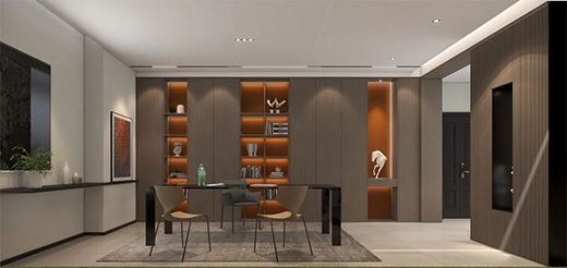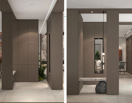 以胡桃木色墻板為主調,突出質感,以鏤空的方式透視另一面,巧思不凡。