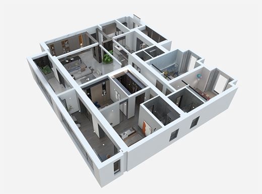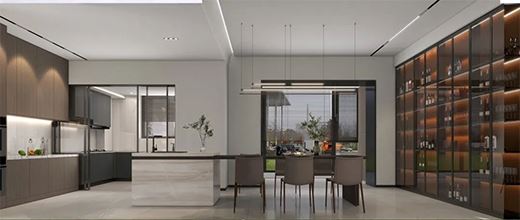 此處餐廚一體化設計,可以看出采用了吧臺+獨立餐桌,雙重用餐區的奢侈模式。