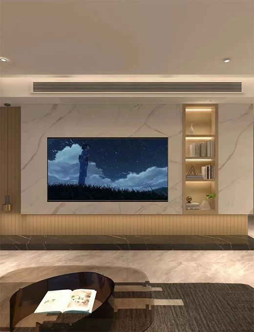 客廳做了懸浮吊頂,吊頂四周是嵌入式反光燈槽,吊頂做了黑色不銹鋼凹槽+射燈