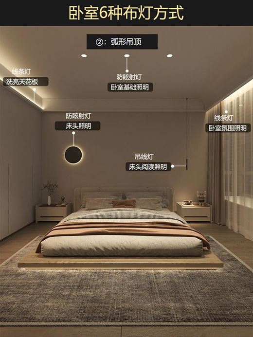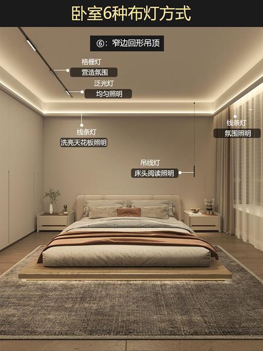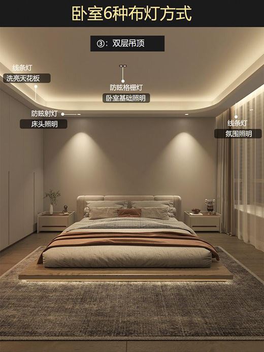 臥室六種布燈方式分享,不同吊頂?shù)牟紵舴绞綍?huì)有不同,視覺感也會(huì)有不同: