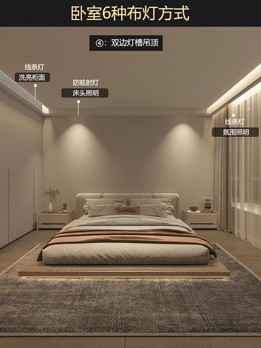 洗墻燈槽安裝線條燈洗亮床頭,床頭柜上方安吊燈增加氛圍和閱讀照明,床尾處用防眩燈滿足基礎(chǔ)亮度。