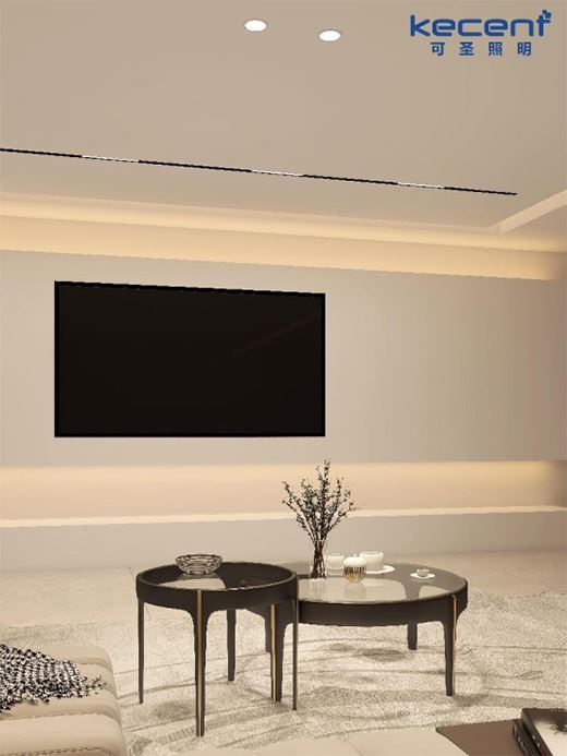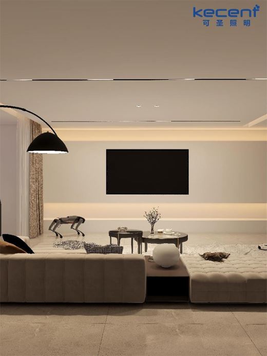 在這個(gè)案例中,客戶家里的電視背景墻雖然并沒(méi)有掛畫或采用射燈洗墻,但電視背景墻本身的設(shè)計(jì)就已經(jīng)足夠簡(jiǎn)潔又出彩,加上常規(guī)明裝線性燈(10W/米 3000K)的發(fā)光點(diǎn)綴,又為電視墻增添上了輕盈感。