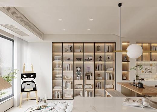 墻面定制裝飾柜,靠窗位置設(shè)計白色柜門,其余柜門采用玻璃材質(zhì)裝飾出定制的高級感,同時又展示出柜體里裝飾品的精美。